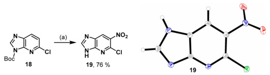 The attempt of introducing the nitro group at the Boc-protected 2-chloro-1-deazapurine (18), in order to introduce the electron-withdrawing nitro group at 6-position, has led to the formation of one single compound, the 2-chloro-1-nitro-1-deazapurine (19), in 76% yield and not the desired 6-nitro derivative (purine numbering). The position of the nitration was additionally proven by an X-ray structure of compound 19 (Scheme 2).