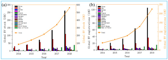 The development of EVs in the world: (a) global EV reserves; (b) global EV registrations. Adapted with permission from Ref. [1]. Copyright 2018, the Elsevier.