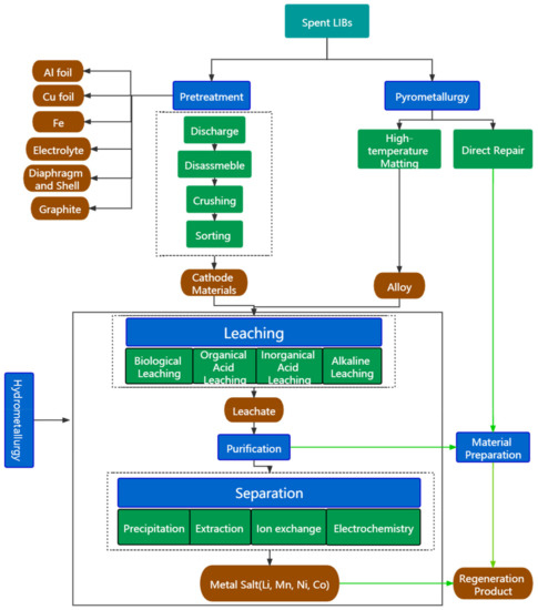 On the other hand, the development of the LIB industry will produce a mass of spent LIBs. In spent LIBs, the proportion of cathode, anode, and electrolyte is about 33:10:12 [5]. If not properly treated, the impact of the heavy metals such as lithium, cobalt, manganese, and nickel in the cathode material, as well as electrolyte and its residual harmful components such as HF, PF5, and alkane, on soil, water, and atmospheric environment is immeasurable [6]. Therefore, recycling valuable metals from spent LIBs is of great ecological and environmental importance. It can alleviate the shortage of valuable metals (lithium, nickel, cobalt, etc.) and accelerate the long-term development of the LIB industry, and also protect the environment [7].