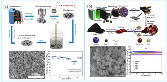 Similar to LiCoO2, spent LiFePO4 can also be repaired by supplementing lithium. In a study by Sun et al., spent LiFePO4 scrap was heated with sucrose and Li2CO3 at 650 °C for 10 h under Ar/H2 in the tube furnace. The repaired cathode materials showed good cycling performance (Figure 4b). The morphology of the regenerated LiFePO4/C is spinel olive type. The repaired cathode materials under different situations can obviously restore the electrochemical cycling performance [29]. It was also found that different calcining temperatures can significantly influence electrochemical performances by influencing particles’ agglomeration. A temperature between 650 °C and 700 °C has proved to be the best condition for regenerating cathode material of LiFePO4 [30,31].