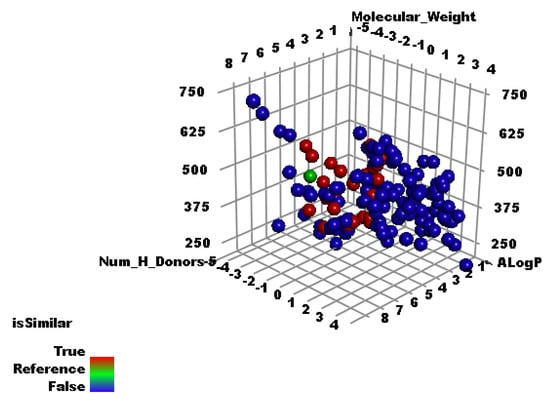 Figure 1 represented the co-crystalized ligand (SAM) (red ball), compounds with good similarities (green balls), and compounds with diminished similarities (blue balls). The degree of molecular likeness or similarity between two compounds depends on a similarity coefficient that is utilized to compute a quantitative score. That calculated score is equivalent to the degree of similarity and is based on the computed values of several structural descriptors. Similarity between two compounds is inversely proportional to the calculated distance between them in the descriptor space [57]. In this work, the distances between the several descriptors were computed to determine descriptor similarity among test compounds and SAM [58]. The computed distances describe the shortest distance between two points. Typed graph distances (Figure 1) show the overall similarity of behavior of the FDA-approved drugs compared to SAM. The study preferred 26 compounds among the most suitable 30 metabolites (Figure 1 and Figure 2, and Table 2).