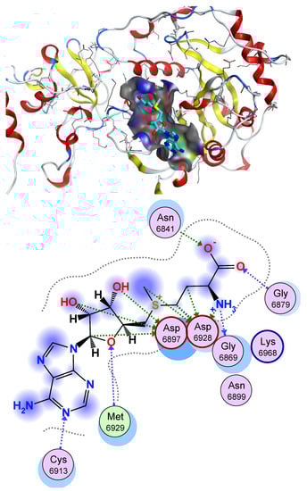 The predicted binding mode of the redocked ligand (SAM) yielded an affinity value of −21.52 kcal/mol. It interacted with its 6-amino-purin moiety and formed one hydrogen bond with Asp6912, in addition to hydrophobic interactions with Leu6898 and Met6929. Moreover, the di hydroxy tetrahydrofuran moiety formed two hydrogen bonds with Tyr6930, and the sulfur atom was involved in electrostatic interaction with Asp6928. Additionally, the terminal NH2 group was found to form one hydrogen bond with Gly6869, and two electrostatic interactions with Asp6928. Finally, the terminal carboxylic group formed one hydrogen bond with Gly6879 (Figure 5).