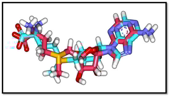 The co-crystalized ligand s-adenosylmethionine (SAM) was used as a reference compound. First, the validation process was carried out to confirm the validity of the docking algorithm in obtaining accurate docking results. This was achieved by redocking the co-crystallized ligand (SAM) with 2′OMTase. The obtained low values of root mean square deviation (RMSD = 1.15 Å) between the native and redocked pose, in addition to the symmetrical superimposition in orientation between both the native (turquoise) and redocked (magenta) co-crystallized poses in Figure 4, guaranteed the valid performance of the docking protocol [36,38], in addition to the docking algorithm’s capability to obtain the reported binding mode of the co-crystalized ligand S-adenosylmethionine (SAM) [59].
