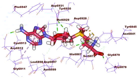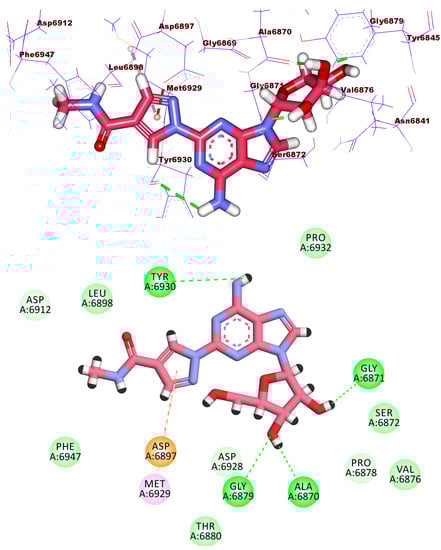 Compound 2176 showed a binding energy of −18.54 kcal/mol. This compound formed four hydrogen bonds in the active site of the target protein. The ribose sugar moiety formed three hydrogen bonds with Gly6879, Ala6870, and Gly6871. Furthermore, the NH group of the 9H-purin-6-amine moiety formed a hydrogen bond with Ty6930. Moreover, the N-methyl-1H-pyrazole-4-carboxamide moiety was incorporated in hydrophobic interaction with Met6929 and one electrostatic interaction with Asp6897 (Figure 9).