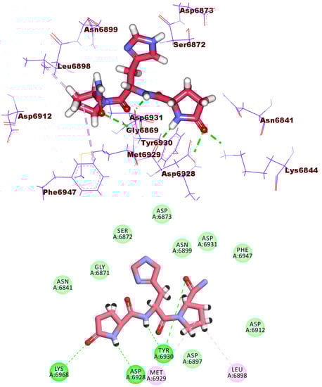 Compound 1187 has a docking score of −18.68 kcal/mol and formed four hydrogen bonds with the crucial amino acids in the active site of the 2′OMTase enzyme. The pyrrolidin-2-one moiety formed two hydrogen bonds with Asp6928 and Lys6968 via its NH and C=O groups, respectively. Furthermore, the NH group of the central amide moiety formed one hydrogen bond with Tyr6930. Moreover, the (S)-pyrrolidine-2-carboxamide moiety formed one hydrogen with Tyr6930 and two hydrophobic bonds with Met6929 and Leu6898 (Figure 6).