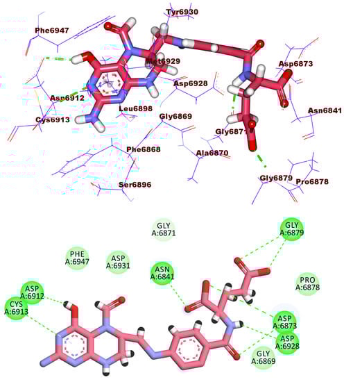Compound 1913 has a docking score of −19.09 kcal/mol, forming six hydrogen bonds within the active site. The 2-amino-4-hydroxy-7,8-dihydropteridine-5(6H)-carbaldehyde moiety formed three hydrogen bonds with Cys6913, Gly6911, and Asp6912 via its NH2, OH groups, and the hetero nitrogen atom at 3-position. In addition, the glutamic acid moiety formed three hydrogen bonds with Asn6841, Gly6879, and Gly6871. Moreover, a carboxylate group of glutamic acid moiety formed one electrostatic interaction with Asp6873 (Figure 7).