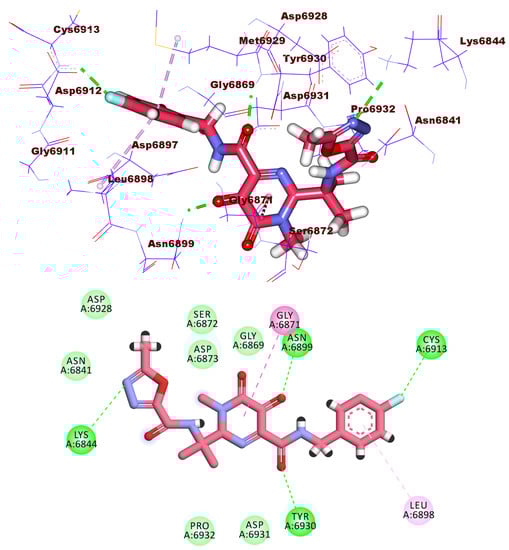 With a docking score of −21.07 kcal/mol, compound 1995 fit well into the active site of the 2′OMTase enzyme and formed four hydrogen bonds. The fluorobenzene formed one hydrogen bond with Cys6913 and one hydrophobic interaction with Leu6898. The carbonyl group of the amide moiety formed one hydrogen bond with Tyr6930. The carbonyl group of 5-hydroxy-3-methylpyrimidin-4(3H)-one moiety formed one hydrogen bond with Asn6899. In addition, the 5-hydroxy-3-methylpyrimidin-4(3H)-one moiety formed hydrophobic bond with Gly6871. The NH group of 2-methyl-1,3,4-oxadiazole moiety formed one hydrogen bond with Lys6844 (Figure 8).