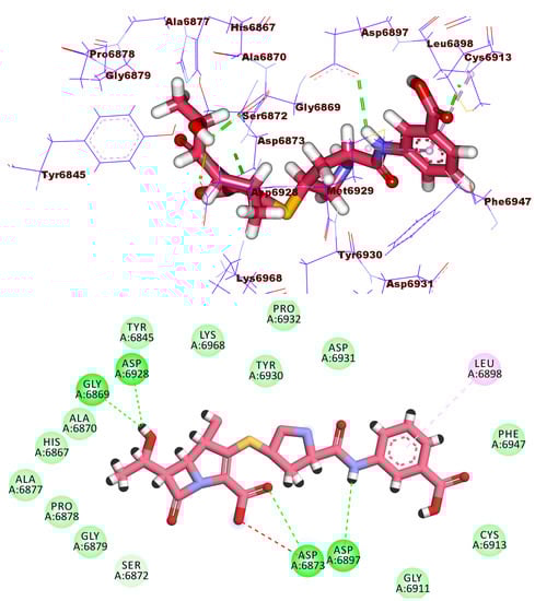 Compound 2396 (Ertapenem) has a docking score of −20.73 kcal/mol and created five hydrogen bonds with the crucial amino acids in the active site of the 2′OMTase enzyme. The benzoic acid moiety formed one hydrogen bond with Cys6913 via its carboxylic group, and two hydrophobic interactions with Met6929 and Leu6898. Furthermore, the NH group formed another hydrogen bond with Asp6897. Moreover, the carboxylate group at 2-position of 1-azabicyclo[3.2.0]hept-2-ene moiety formed one hydrogen and one electrostatic bond with Asp6873. The terminal hydroxyl group formed two hydrogen bonds with Asp6928 and Gly6869 (Figure 10). Although Ertapenem showed a binding energy less than Raltegravir, it showed an ideal binding mode like that of the co-crystallized ligand (SAM). It occupied all sub pockets of the active site and bound the crucial amino acids. Accordingly, it was used for further in silico testing via MD simulations.