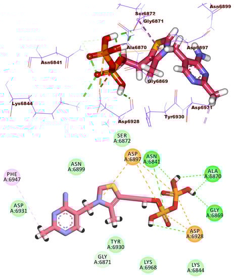 As demonstrated in Figure 12, compound 2612 had a high potential binding affinity (ΔG = −18.03 kcal/mol) with 2′OMTase enzyme active site. The strong binding affinity is assumed to be due to the formation of four hydrogen bonds in addition to many hydrophobic and electrostatic attractions. The terminal diphosphate moiety formed four hydrogen bonds with Gly6871, and Asn6841. It also formed three electrostatic attractions with Asp6928. In addition, the 4-methylthiazol-3-ium moiety formed a hydrophobic interaction with Gly6871 and an electrostatic attraction with Asp6897. Furthermore, the 2-methylpyrimidin-4-amine moiety was incorporated in a hydrophobic attraction with Phe6947.