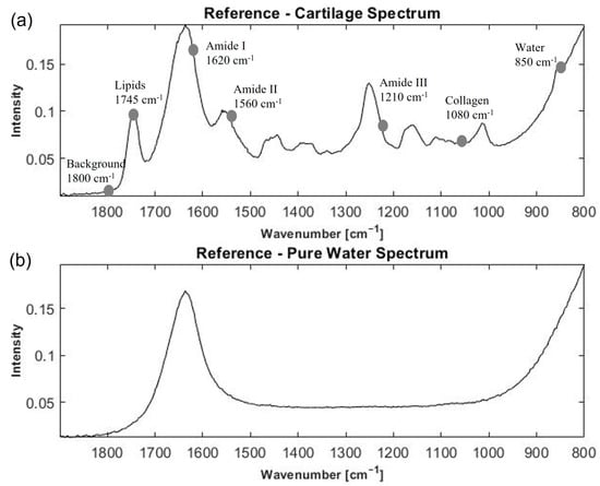 Examples of water and cartilage spectra. (a) Cartilage spectrum from dataset 1 (human), (b) Pure water spectrum.