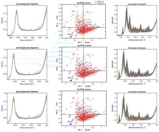 In the proposed Multiple Signal Correction (MSC) based preclassification method, we suggest using water spectrum as a reference in the MSC model. Figure 3 shows the results of preclassification when a spectrum of water sample was measured and used in the algorithm. For this dataset, an optimal was found to be 0.13 for the broadband dataset 1 (human dataset measured with Alpha II FTIR spectrometer). This selection of the threshold was based on the visual inspection of the spectra. Thus, if a spectrum had an higher than the threshold , the algorithm assigned the spectrum to be an analyte-rich (cartilage) spectrum, while otherwise it was identified as an analyte-poor (water or low absorbance) spectrum. We can see in Figure 3 that water—spectra with low cartilage signals—is correctly separated from the cartilage spectra (see Figure 3a,c,d,f,g,i). From a total of 814 spectra in dataset 1, 21 spectra were identified as water—low cartilage signal spectra. The annotations performed using the PCA score plots in Figure 3b,e,h support the selection of optimal thresholds. We can clearly see a group of water spectra or analyte-poor spectra in blue, and when the threshold is increased, some cartilage or analyte-rich spectra were identified as water spectra (see also Supplementary Material Figures S2 and S3 for datasets 2 and 3). The PCA was done on raw spectra without any pre-processing.