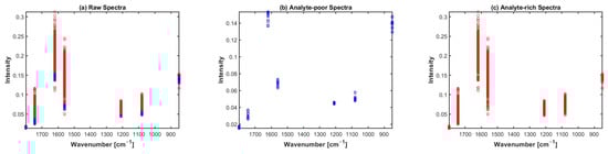 In addition to PCA, an annotation by considering the signal-to-noise ratio was used, , where signal represents the absorbance signal in the region 920–1200 cm related to polysaccharide (chemical), and the noise is calculated in the region 2000–2100 cm. Almost the same spectra were annotated by both PCA analysis and and these spectra were correctly classified by the MSC preclassification algorithm; spectra separation can be seen for in Figure 4.