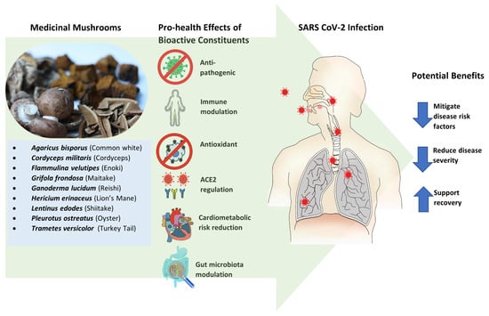 Coronavirus disease 2019 (COVID-19), caused by the severe acute respiratory syndrome coronavirus 2 (SARS CoV-2), presents an opportunity to consider how macro-fungi or their derivatives might be harnessed and utilised as therapeutic agents. In particular, this pertains to their use in optimising health to avoid or mitigate risk factors, prevent severe disease outcomes, and improve recovery prospects as commonly noted or experienced. For example, the immune response is crucial in COVID-19 pathogenesis, and its modulation to control the hyperinflammatory response would be advantageous. Additionally, the virus appears to have a higher prevalence for and more severe outcomes in populations with particular risk factors and comorbidities associated with age, obesity, metabolic, cardiovascular, and inflammation-mediated conditions [,]. Many of these factors are known to respond to, and are modifiable through, dietary or lifestyle interventions. Therefore, with their potential and specific therapeutic effects, MMs seem well placed to be considered as nutraceutical options, or at the very least, as health-promoting food sources. Moreover, as vaccines become the mainstay for preventing severe outcomes, finding effective immune-enhancing adjuncts will be beneficial.