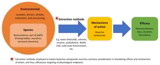 These highlights demonstrate that there may be variations in the isolates depending on the methods utilised. Additionally, more modern and improved techniques may produce a superior raw product, potentially creating differences in the efficacies associated with mechanisms of action and health benefit claims. Therefore, it seems essential to their application to expect mushroom therapeutic treatments to be produced from regions and in conditions that result in the most efficacious response, according to the most current research. As more and more commercialised products are becoming available for general purchase, as well as in therapeutic settings, it is vital to ascertain pharmacokinetics, timing of administration, dosage, mode, and formulation variances []. These are all factors to be considered in the application of bioactive compounds. This can only be accurate and informed if the whole plant or extract characteristics have been clearly identified and elucidated. Figure 2 summarises important considerations and some potential limitations as presented in this appraisal. Key inputs into isolating bioactive compounds are influenced by many factors. Extraction methods, in particular, appear to be very important. Effects from the extracts from the same and different species can vary and even produce an opposite effect in activity. Beyond this, other factors need consideration if MMs are to be utilised for therapeutic and treatment purposes.