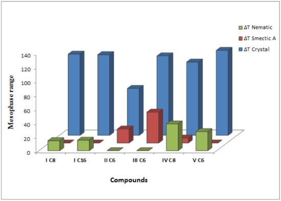 It is well known that the increment in the dipole moment highly affected the mesophase range [,]. It could be explained in terms of the degree of packing of the molecules in the liquid crystalline phases which affect the mesophase stability.