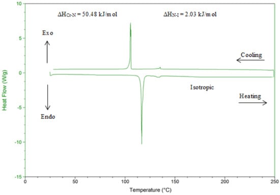 The investigated compounds were characterized for their mesomorphic behavior by differential scanning calorimetry (DSC) and polarized optical microscopy (POM). The types of mesophases were identified by POM. The phase transition temperatures (°C), enthalpy of transition ΔH (kJ/mol), and normalized entropy of transition ΔS/R were measured by DSC. All the results are tabulated in Table 1 and the mesophase ranges are graphically represented in Figure 2. An indicative example demonstrating the DSC curve of the heating/cooling cycles for I C8 is shown in Figure 3. The presence of sharp peaks in the DSC thermogram indicates the phase changing between the crystal and the liquid crystalline. Additionally, the small peaks represent the transition from the liquid crystalline phase to the isotropic liquid. The type of mesophase texture for I C16 is represented in Figure 4.