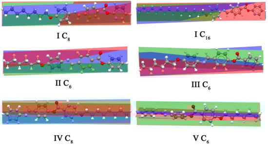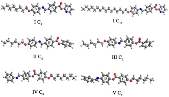 Calculated molecular geometrical structures of compounds I C8, I C16, II C6, III C6, IV C8, and V C6 (blue—N, red—O, white—H, grey—C).