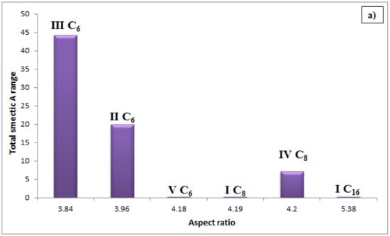 It is noticed from Figure 7 that only compounds II C6, III C6, and IV C8 have a smectic A mesophase. It is worth mentioning that changing the orientation of the mesogenic core (COO) in II C6 and III C6 may alter the aspect ratio value. Compound II C6 had a higher aspect ratio than compound III C6 with the same chain length (C = 6), but the smectic A mesophase range was lower in compound II C6 (ΔT = 20 °C) compared to what III C6 had (ΔT = 44.2 °C).