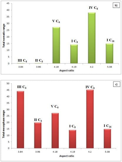 Dependence of aspect ratio with (a) Smectic range (b) Nematic range (c) Total mesophase range of compounds I C8, I C16, II C6, III C6, IV C8, and V C6.