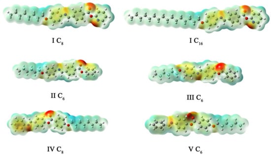 The estimated molecular electrostatic potentials (MEP) of compounds I C8, I C16, II C6, III C6, IV C8, and V C6.