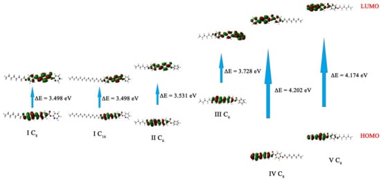 The estimated frontier molecular orbitals of compounds I C8, I C16, II C6, III C6, IV C8, and V C6.
