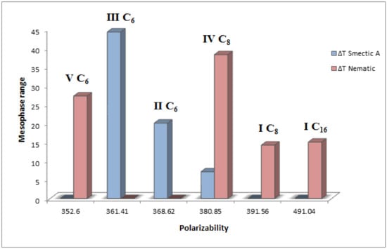 It is clear from Figure 12 that the polarizability of compound III C6 was more than that of compound V C6 with the same chain length (C=6), and such higher polarizability enhanced the mesophase range with the formation of smectic mesophase for compound III C6. On the other hand, the orientation of the mesogenic core highly affected the polarizability to show higher polarizability with a lower mesophase range. The orientation of the carboxylate group (COO) obviously had a high impact on both the polarizability and the mesomorphic behavior. Compound II C6 had lower polarizability than compound IV C8 with different mesomorphic behavior. Additionally, the presence of nitrogen atoms in the terminal ring of compound I C8 increased the polarizability compared to its analogous compound II C6 but it also decreased the mesophase range and the type of texture was changed from smectic A (II C6) to nematic (I C8).