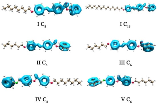 Isosurface maps of LOL- π (Isovalue = 0.3) of compounds I C8, I C16, II C6, III C6, IV C8, and V C6.