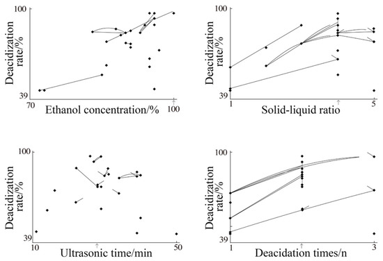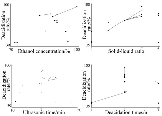 The position indicated by the abscissa arrow was the best value of this factor. It was preliminarily judged from the position indicated by the arrow in the mapping diagram of the first round of optimization conditions. The optimization results of the deacidification process were as follows: ethanol concentration (100%), solid–liquid ratio (1:4), ultrasonic time (29 min), and number of deacidification cycles (two). However, due to the scattered mapping results in the figure, these were insufficient to reflect the optimization results, hence a second round of optimization was needed to obtain a more reliable optimization process.
