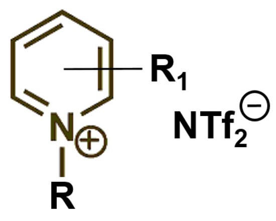 Unfortunately, only very few vapor pressures and vaporization enthalpies are available for ionic liquids [12]. This work contributes with six new datasets on the vaporization thermodynamics of pyridinium-based ionic liquids with bis(trifluoromethylsulfonyl)imide anion (see Figure 1) and the investigation of the interplay of structure–property relationships in ionic liquids, and leads to the development of a new general approach to predict vaporization enthalpies of ionic liquids using the available knowledge on the vaporization thermodynamics of molecular liquids. In our previous studies, we found that ionic liquids containing the [NTf2] anion are best suited for vapor pressure measurements because of their remarkable thermal stability. The pyridinium-based ionic liquids are used as the first part to understand structure–property relationships in ionic liquids. The similar study of the imidazolium ILs is ongoing.