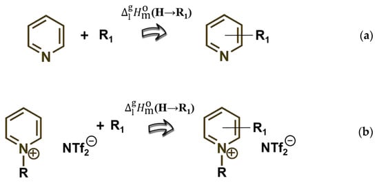 Indeed, the vaporization enthalpies of, e.g., pyridine derivatives, can be reliably predicted with the help of a simple contribution, (H→R1), representing the replacement of an H atom in pyridine with any substituents (see Figure 2a). It was found that, for pyridinium-based ionic liquids, the same numerical values for the contributions (H→R1) can be used to estimate their vaporization enthalpies (298.15 K) as given in Figure 2b.
