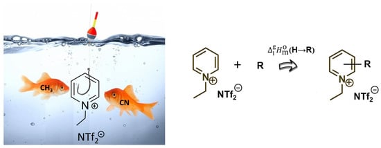 Indeed, [1-C2-Py][NTf2] as the “centerpiece” model already bears the main energetic contributions to the vaporization enthalpy, due to the sum of the Coulomb and Van der Waals interactions present in the liquid phase. Such a bulk contribution is unique to [1-C2-Py][NTf2] as the “centerpiece” molecule and can hardly be captured by any other method. This special feature of the “centerpiece” approach significantly increases the reliability of the property prediction for similarly shaped molecules, e.g., [R-1-C2-Py][NTf2] (see Figure 3, right), where substituent (with contribution (H→R) to the vaporization enthalpy) is simply attached to the aromatic ring of the cation (see Figure 3, left),. For this reason, the (298.15 K) estimated using the “centerpiece” approach for the [R-1-C2-Py][NTf2] ionic liquids can be ad hoc regarded as reliable, since the “main” contribution to the vaporization energetics from the [1-C2-Py][NTf2] is already well established and consistent with the results available for the [1-Cn-Py][NTf2] series (R = alkyl with n= 1-6) [15]. It is quite evident that the contributions, (H→R), for the “appending” to the [1-C2-Py][NTf2] “centerpiece” are comparatively small and affordable for a reliable assessment. As a matter of fact, in our recent work [13], we have shown that the (H→Me) and (H→CN) contributions derived from the molecular liquids (substituted pyridines and quinolines) are generally transferrable to ionic liquids. The numerical values for these contributions are presented in Table 10.