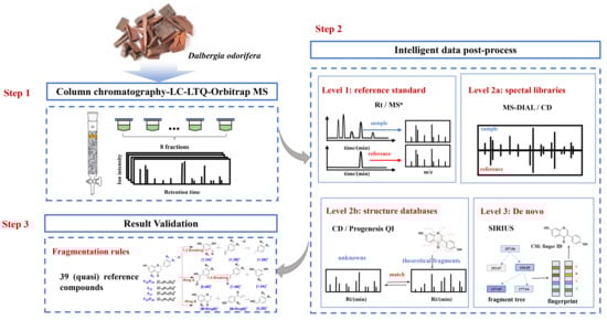At the first step, the extract was fractionated by column chromatography before LC–MS detection. This step makes it possible to detect more components in D. odorifera by increasing the peak capacity, reducing the interference of co-eluting components and enriching the minor components []. Subsequently, reference substances and three in silico data-processing solutions were used to improve the reliability and efficiency of the identification []. Following Schymanski rules, the identification results were divided into three levels (1, 2a, 2b and 3), according to the confidence and the analysis mechanism. Finally, the identification results were confirmed by manual interpretation of the fragments in levels 2a–3.