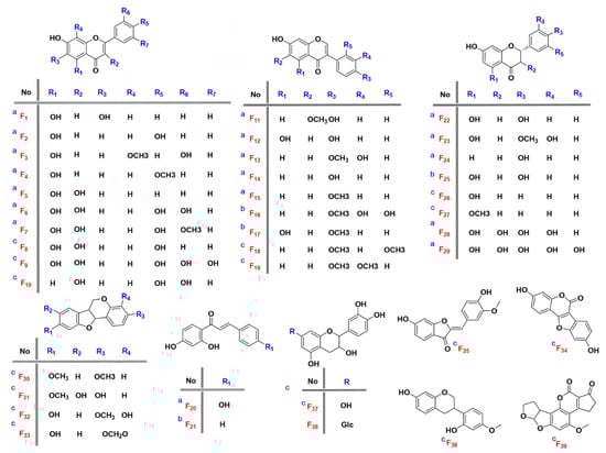 To identify known compounds, all the available reference standards of flavonoids which potentially exist in D. odorifera were collected in the author’s laboratory. Independent and orthogonal data, including retention time, accurate mass and MS/MS, were acquired for these compounds under identical experimental conditions []. The candidates were filtered according to the following rules: (1) a retention time error not exceeding 0.05 min, (2) an exact mass error not exceeding 5 mDa and (3) matching fragment ions. Seven compounds (F12, F13, F14, F15, F20, F22 and F24) were identified by using this method, and their structures are shown in Figure 2. Albeit unambiguous identification of the targets, it is difficult to obtain enough reference materials for extensive compound identification, due to high price of reference substances, difficulty of collection and lack of reference substances for some compounds. Therefore, the remaining 190 compounds were performed with the following level 2a identification.
