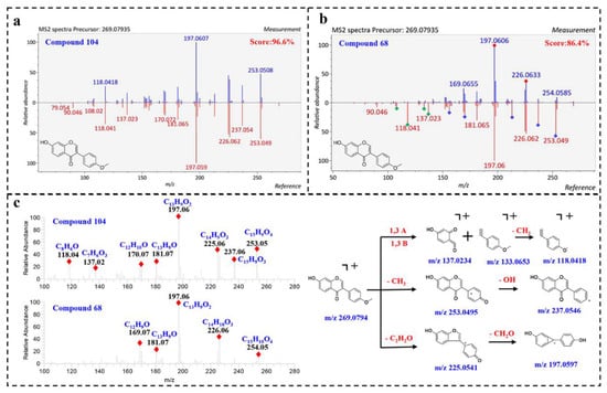 Compound 104 (Rt = 24.13 min) displayed a precursor ion [M + H]+ at m/z 269.0794, matching the molecular formula [C16H13O4]+. By comparing the MS/MS spectrum with positive spectral database, it was identified as 7-hydroxy-3-(4-methoxyphenyl)-4H-chromen-4-one (Biochanin B) with a total score at 96.6%. As shown in Figure 3a, the fragmentation spectrum of compound 104 highly matched with the reference spectrum in fragmentation and peak intensity. Furthermore, the instrument of the reference spectrum was the same as our instrument, thus further illustrating the reliability of the result. Correspondingly, compound 68 was also assigned to Biochanin B, with a lower similarity of 86.40%. However, the fragmentation spectrum of compound 68 was visually different from the reference spectrum. As shown in Figure 3b, the product ions at m/z 226.062 and 197.060 were well matched in the query and reference spectrum, while some product ions (m/z 253.049, 237.054, 213.091, 181.065, 170.072 and 156.057) show different relative peak intensities, and some product ions (m/z 137.032, 133.056, 118.041 and 108.02) are in very low abundance. The product ions at 137.032, 133.056 and 118.041 in compound 104 match the molecular formula [C7H5O3]+, [C9H9O]+ and [C8H6O]+, corresponding to 1,3A, 1,3B and [1,3B-CH3]+ ions, indicating that compound 68 has no methoxy group in the B ring (Figure 3c). In summary, it was speculated that compound 68 was also an isoflavone, a positional isomerism of 104.