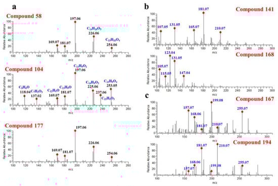 Progenesis QI is a small molecule discovery analysis vehicle for processing metabolic profiling data. It is worth noting that, on top of the commercial databases, Progenesis QI software also supports users when they define their own structure databases for compound characterization []. Here, we identify the flavonoids in D. odorifera by searching four molecular-structure databases with Progenesis QI. Two online databases, HMDB and Natural Products (NPDB), and the other two self-built databases, namely a structure database of D. odorifera components obtained from Reaxys (DODB, 112 components) and a theoretical structure database of flavones (TSDB, 40,095 components), were consulted, respectively. As a result, 157 components were annotated in HMDB, 177 components in NPDB, 175 components in DODB and 178 components in the TSDB. Although the number of annotated components in different databases varied slightly, they worked out in a similar way. For instance, compound 58 (Rt = 15.05 min) exhibited a precursor ion at m/z 269.0806 and was characterized as formononetin in NPDB, DODB and TSDB. In addition, for those isomers with similar structures, they usually produce similar fragmentation spectra, causing equivocal annotations. As shown in Figure 4a, compounds 58, 104 and 177 generated the same product ions at m/z 226.0635, 197.0607, 181.0658 and 169.0656, causing them all to be characterized as formononetin. However, as one can see from Figure 4a, the product ions of m/z 253.0608, 226.0635, 181.0657, 137.0239 and 118.0418 vary greatly in different compounds, indicating the differences between their structures. In summary, it can be concluded that searching in structural databases can only distinguish compounds with great structural differences.