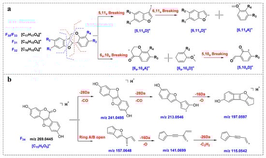 Proposed MS fragmentation pathways of compounds F30–F34. (a) F30–F33; (b) F34.