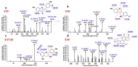 Proposed fragmentation pathways and fragments annotation of F35–F39. (a) F35; (b) F36; (c) F37 and F38; (d) F39.