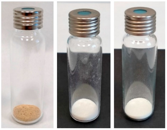 Figure 1 shows the vacuum-freeze-dried melon pomace “As-it-Is” at t0 time (M_AI_V_t0), and the bleached fiber immediately after the H2O2 treatment (M_B_O_t0) and after a storage period of 24 months in the closed vial, in the dark, and at room temperature (M_B_O_t24).