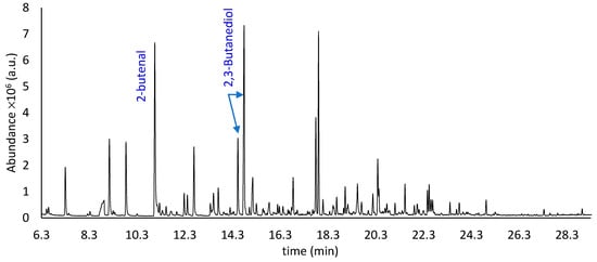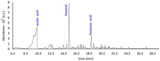 Figure 3 shows the HS-SPME chromatogram related to the oven-dried bleached fiber from the winter melon pomace (M_B_O_t0). These specimens were immediately processed with the GC-MS instrumentation described in Section 4.