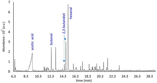Total ion current chromatogram of VOCs from the M_AI_V_t0 fibrous sample, obtained using HS-SPME-GC-MS (a.u. = arbitrary units).