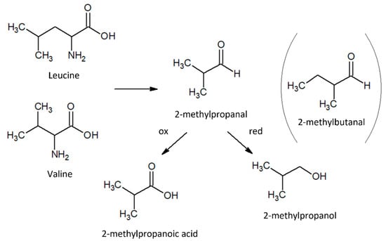 Pentanal and heptanal, on the other hand, showed exactly the opposite behavior, increasing their concentration by about three to four times, respectively, immediately after the treatment of the fiber with H2O2 (M_B_O_t0). During the aging of the DF, these two aldehydes were partially converted to their most oxidized form, namely pentanoic and heptanoic acid, respectively. This may be due to radical oxidation processes initialized by oxygen present in the residual atmosphere inside the vials storing the samples. The branched-chain molecules 2-methylbutanal and 3-methylbutanal, described as having a ‘malty-like’ aroma, were detected in all three of the different samples analyzed. These compounds are suggested to be synthesized from isoleucine and leucine, respectively, even though the pathways are not well recognized yet [30]. However, which fraction of the total quantity of 2-methylbutanal and 3-methylbutanal is not directly related to the aforementioned amino acids cannot be established. It is assumed that 2-methylpropanal is also an intermediate product in the catabolism of two amino acids (leucine and valine); together with 2-methylbutanal, it is considered a key compound in several foods, including melon. Following the literature suggestions, it should, therefore, be converted into parental compounds—the oxidized one, 2-methylpropanoic acid, or the reduced one, 2-methylpropanol [19] (Figure 5).