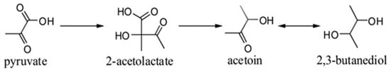 For example, 2,3-butanediol is a product of the acetoin pathway in many bacterial species. This diol is produced from pyruvate during fermentation processes via several intermediate metabolites, where different enzymes are involved. At present, the exact metabolic function of 2,3-butanediol is not well known. It may play a role in avoiding excessive intracellular acidification through the conversion of an acid compound (pyruvic acid) to a neutral one (acetoin) [45,46], as represented in Figure 6.