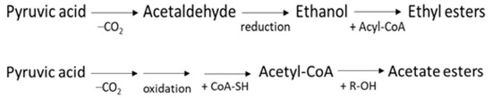 Scheme of the biosynthetic pathway which leads to the formation of ethyl and acetate esters, starting from pyruvic acid [25].
