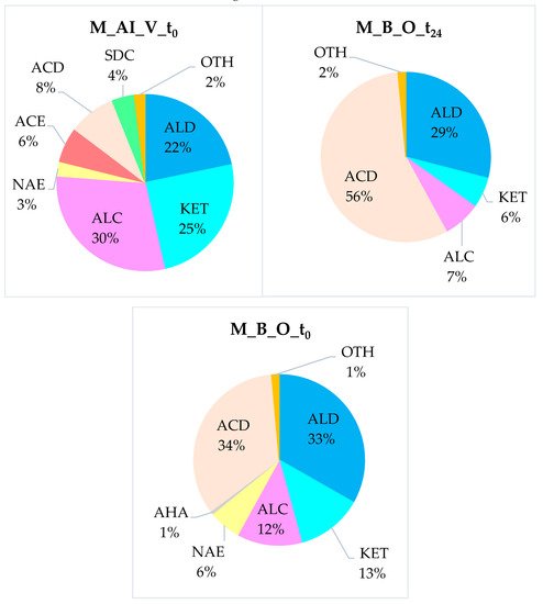 - Molecules developed from the DF treatment with H2O2 (organic acids): The fraction of acids was the largest in the M_B_O_t24 sample (≈57%), while it covered only about 10% of the total volatile organic fraction of the M_AI_V_t0 and reached ≈34% in the M_B_O_t0 ones. Certainly, the action of H2O2 strongly contributed to the development of these analytes, oxidizing some of the molecules originally present in the starting matrix, to give products with acid functional groups. In addition, the oxygen present in the residual atmosphere of the preservation vials also led to an increasing quantity of organic acids over time, with O2 acting as a starter for radical oxidation processes.