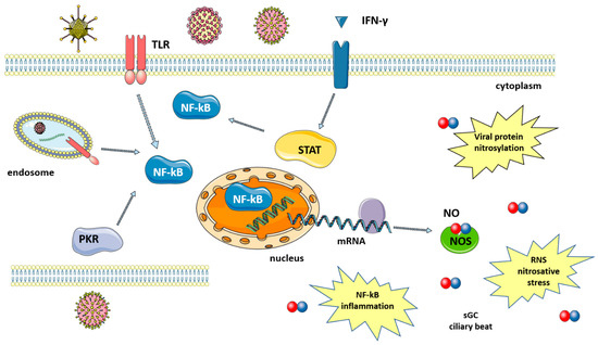 Many studies have shown that a number of diseases caused by viral infection are characterized by an increase in NO levels. Indeed, following infection, the large amounts of NO that are necessary to fight viruses are produced thanks to the upregulation of iNOS via the activation of several pathways that are mediated by: (i) toll-like receptors (TLRs); (ii) signal transducer and activator of transcription 1 (STAT-1); and, (iii) protein kinase-R (PKR) [8], as summarized in Figure 1. TLRs are expressed in immune (macrophages, lymphocytes) and non-immune (epithelial) cells where they detect pathogen-associated molecular patterns (PAMPs), which, in the case of viruses, can be the viral nucleic acid or components of viral envelopes. The recognition of PAMPs by TLRs results in the activation of signaling pathways that converge in the activation of transcription factors, nuclear factor kappa-light-chain enhancer of activated B cells (NF-κB) and activator protein 1 (AP-1), which enters the nucleus and upregulate iNOS transcription [19]. A second pathway is mediated by interferon-gamma (IFN-γ), which is produced by immune cells around 24–26 h after infection. IFN-γ induces the phosphorylation and activation of Janus kinase 1 (Jak1), which, in turn, phosphorylates and thus activates STAT-1, leading again to the upregulation of iNOS [20]. Finally, double-stranded RNA-dependent protein kinase (PKR), activated by viral infections, plays a major role in the activation of iNOS through the NF-κB pathway [21].