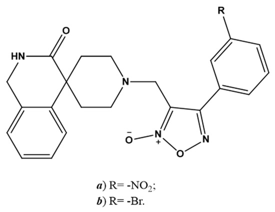 Chemical structure of NO-releasing inhibitors of SARS-CoV-2 proteases. (a,b) 4-phenyl furoxan derivatives.
