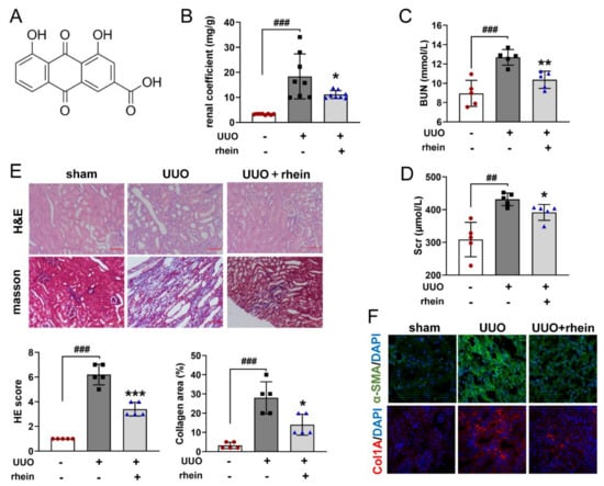 Rhein attenuates UUO-induced renal fibrosis in rats. The left ureter of rat was ligated in two places and cut between the two ligatures (UUO operation). The rats were i.g. administered with or without rhein at 100 mg/kg per day from days 1 to 14 after UUO operation. (A) Structure of rhein; (B) renal coefficient; (C,D) contents of BUN and Scr in serum; (E) representative images of kidney samples stained with H&E and Masson (scale bars, 100 μm), and quantitative analysis of HE score and collagen area percentage; (F) representative images of kidney samples immunostained with α-SMA and Col1A (n = 3). Data were expressed as mean ± SD (n = 5). ## p < 0.01, ### p < 0.001, vs. sham rats; * p < 0.05, ** p < 0.01, *** p < 0.001, vs. UUO rats.