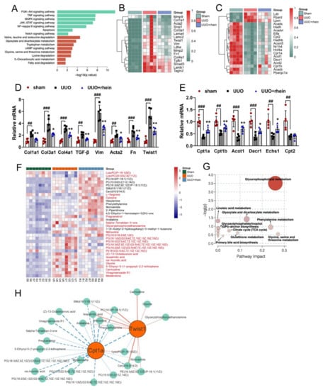 Transcriptomic and metabolomic analysis of UUO-induced rat kidneys. Rats were operated and treated in the same manner as in Figure 1. Total RNA extracted from kidney samples was used for transcriptomic analysis, and acetonitrile extract from kidney samples was used for metabolomic analysis. (A) KEGG enrichment pathways of differential genes between UUO and sham rats with q-value < 0.05 and log2(FoldChange) > 1; RNA sequencing analysis of genes associated with (B) fibrosis (n = 4) and (C) fatty acid metabolism (n = 4); mRNA expressions associated with (D) fibrosis (Col1a1, Col3a1,Col4a1, TGF-β, Vim, Acta2, Fn1 and Twist1) and (E) fatty acid metabolism (Cpt1a, Cpt1b, Acot1, Decr1, Echs1 and Cpt2) in rat kidney samples were determined (n = 5); (F) heatmap of metabolites in rat kidney samples (n = 8); (G) KEGG enrichment pathways of differential metabolites between UUO and sham rats with VIP > 1 and p < 0.05; (H) network diagram of Twist1 gene, Cpt1a gene and differential metabolites in kidney of UUO and sham rats. Data were expressed as mean ± SD. ## p < 0.01, ### p < 0.001, vs. sham rats; * p < 0.05, ** p < 0.01, vs. UUO rats.