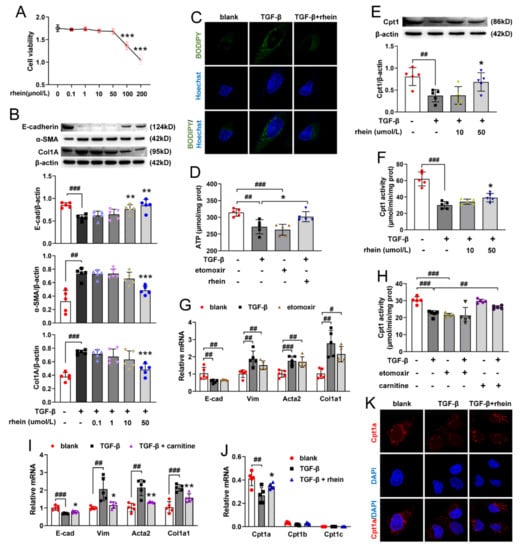 Rhein reverses TGF-β-induced EMT in RTE cells by promoting Cpt1a activity. (A) Cell viability in RTE cells incubated with rhein at indicated concentrations for 24 h. RTE cells were incubated with 10 ng/mL TGF-β and rhein at indicated concentrations for 24 h, (B) protein expressions of E-cadherin, α-SMA and Col1A; (C) representative cell images of lipid droplets stained with BODIPY (rhein at 50 μmol/L, ×630). (D) Intracellular ATP levels in RTE cells incubated with 10 ng/mL TGF-β and 50 μmol/L rhein, or with 40 μmol/L etomoxir, for 24 h. RTE cells were incubated with 10 ng/mL TGF-β and 10 or 50 μmol/L rhein for 24 h, (E) protein expression and (F) activity of Cpt1. RTE cells were incubated with 10 ng/mL TGF-β and 50 μmol/L rhein or 0.5 mmol/L carnitine, or with 40 μmol/L etomoxir, for 24 h, (G,I) mRNA expressions of E-cadherin, vimentin, Acta2 and Col1a1; (H) Cpt1 activity. RTE cells were incubated with 10 ng/mL TGF-β and 50 μmol/L for 24 h, (J) mRNA expressions of Cpt1a, Cpt1b and Cpt1c; (K) representative images of cells immunostained with Cpt1a (×630). Data were expressed as mean ± SD (n = 5). # p < 0.05, ## p < 0.01, ### p < 0.001, vs. blank cells; * p < 0.05, ** p < 0.01, *** p < 0.001, vs. TGF-β- or etomoxir-induced cells.
