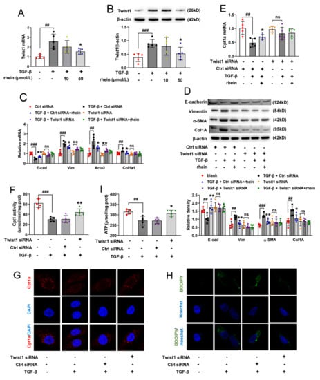 Twist1 is essential for Cpt1a-mediated FAO depression in RTE cells. (A) mRNA and (B) protein expression of Twist1 in RTE cells incubated with 10 ng/mL TGF-β and 10 or 50 μmol/L rhein for 24 h. After Twist1 transfection, RTE cells were incubated with 10 ng/mL TGF-β and 50 μmol/L rhein for 24 h, (C) mRNA and (D) protein expressions of E-cadherin, vimentin, Acta2 and Col1a1, (E) Cpt1a mRNA and (F) Cpt1 activity were detected; (G,H) representative images of cells immunostained with Cpt1a or stained with BODIPY (×630); (I) intracellular ATP levels. Data were expressed as mean ± SD (n = 5). ## p < 0.01, ### p < 0.001, vs. blank cells; * p < 0.05, ** p < 0.01, vs. TGF-β-induced cells.